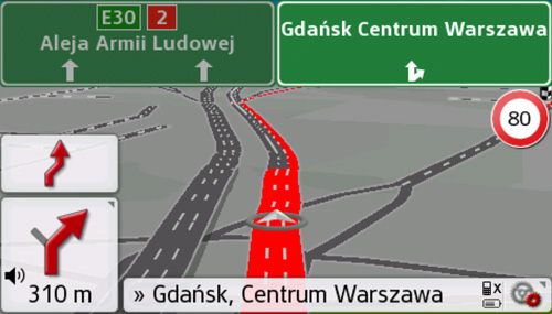 Asystent Pasa skrętu Pro 3D Gdy zbliża się zmiana pasa pokazuje ten właściwy w formie animacji. Dzięki temu kierowca z wyprzedzeniem będzie wiedział jak ma pojechać. Właściwa trasa jest wyraźnie zaznaczona na czerwono.